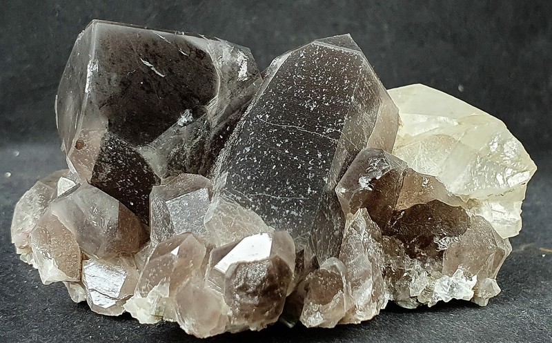 Die schwärzlichen, sehr dunklen Rauchquarze (Morione) zeigen auf den Flächen hohen Glanz.