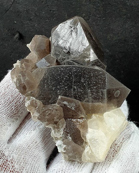 G5-C-11b: Rauchquarz-Gruppe aus drei Kristallen bis ca. 55 mm / teils hoher Glanz und verheilte Anwachserflächen / Größe: ca. 55 x 55 x 35 mm / Gewicht: 89 g / 18,00 €