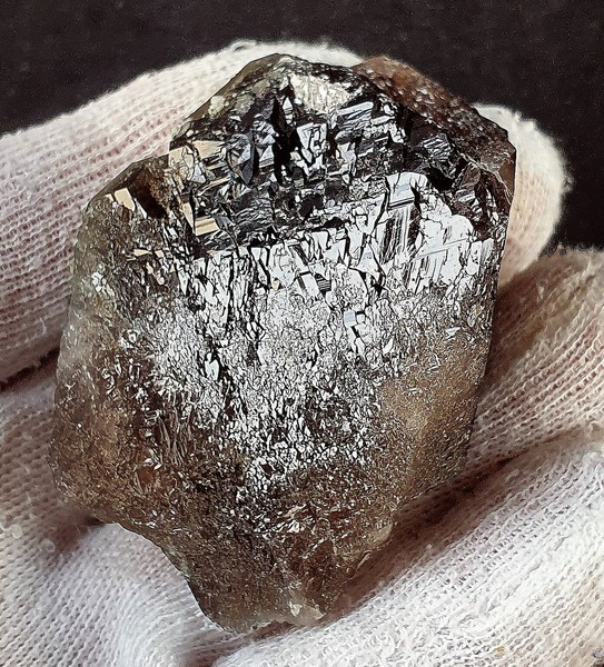 Dieser recht dunkle Rauchquarz zeigt guten Glanz aus den Flächen. An zwei ehemaligen Bruch-Partien nist der Kristall komplett mit vielen kleinen Flächen rekristallisiert. Unterhalb der Oberfläche gibt es silbrig glänzende Einschlüsse von Chlorit. An einer Kante sind weißliche innere Brüche und ein Gesteinseinschluss zu sehen (siehe Bilder 2 und 5). Gewicht: 84 g.