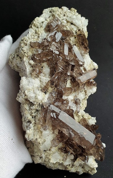 Auf Granit-Matrix sind auf einer Seite viele helle Rauchquarze bis ca. 50 mm gewachsen. Sie zeigen hohen Glanz, sind teils recht klar und oft langprismatisch ausgebildet. Es gibt im Zentrum der Stufe einen unauffälligen Ausbruch von mehreren Kristallen (siehe Bilder). Die Rückseite ist mit Stilbiten bis ca. 2 mm und unscheinbaren Adularen bewachsen. Gewicht: 1283 g