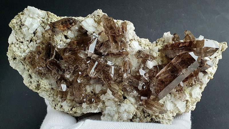 Auf einer Seite der ausgelaugten Granit-Matrix sind viele intensiv braune, sehr klare und hochglänzende Rauchquarz-Kristalle gewachsen. Sie messen bis ca. 50 mm und sind teils als Doppelender ausgebildet. In hohem Kontrast dazu gibt es dazwischen viele schneeweiße und scharfkantige Adulare bis ca. 15 mm. Die Stufe ist an der Unterseite geschnitten. Gewicht: 761 g.