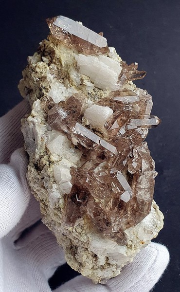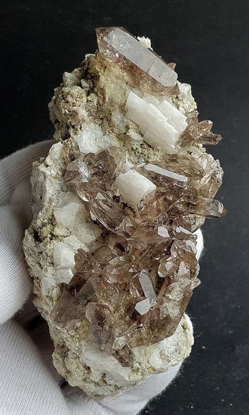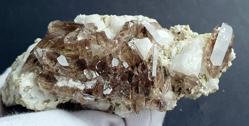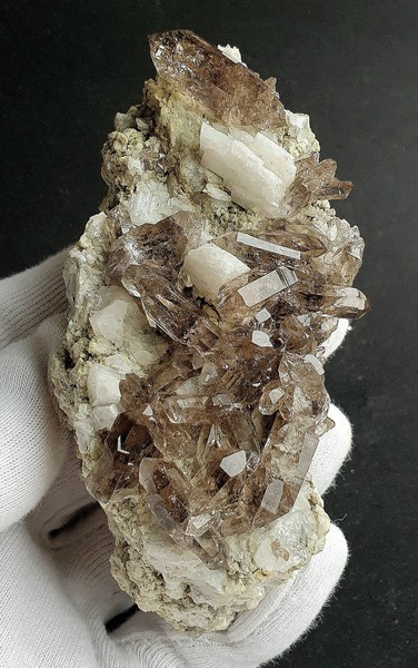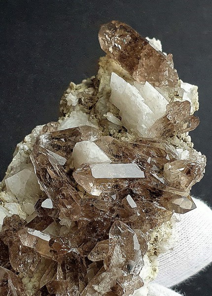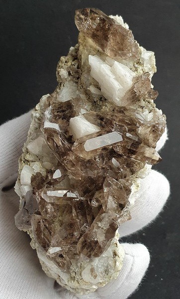 Auf einer Seite der ausgelaugten Granit-Matrix sind intensiv braune, oft klare und hochglänzende Rauchquarz-Kristalle gewachsen. Sie messen bis ca. 30 mm und sind teils als Doppelender ausgebildet. In hohem Kontrast dazu gibt es dazwischen viele schneeweiße und scharfkantige Adulare bis ca. 15 mm. Die Stufe ist an der Unterseite geschnitten. Gewicht:216 g.