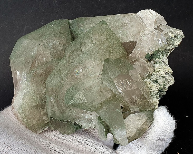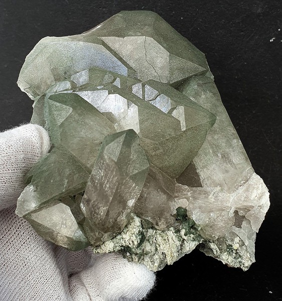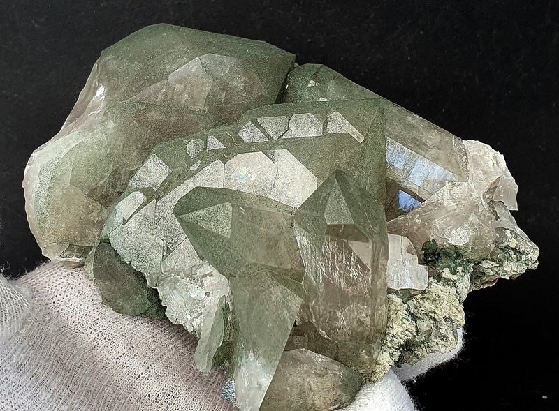 Auf wenig Gesteinsmatrix sind einige transparente oder klare Bergkristalle bis ca. 70 mm gewachsen. Diese sind meist leicht mit Chlorit belegt und zeigen daher matten Glanz. Eine Seite weist viele rekristallisierte Spitzchen auf. Dazu gehört wenig Adular. Gewicht: 476 g.