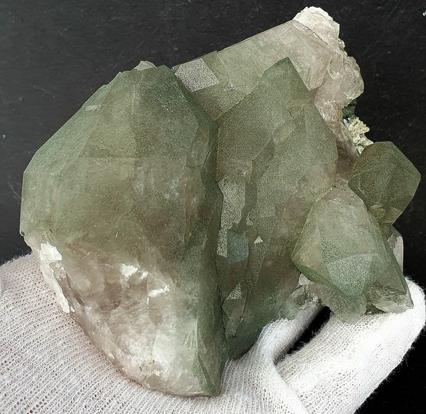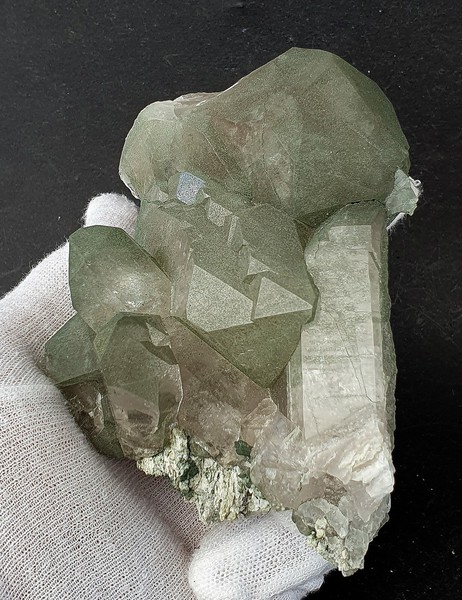 Dieser recht klare Bergkristall mit seinen drei Anwachsern ist rundherum kristallisiert. Eine Seite ist mit sehr vielen Flächenkomplett rekristallisiert (siehe Bild 2). Ein Anwachser-Quarz ist teils mit Chlorit belegt. Gewicht: 365 g.