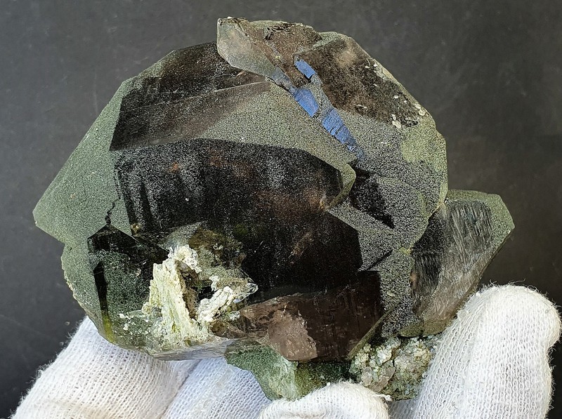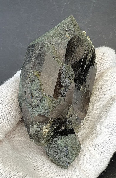 Auf dünner Quarz-Matrix ist ein oberflächlich chloritisiertes helles Rauchquarz-Gwindel von ca. 70 x 45 x 30 mm gewachsen. Dazu gehören einige Quarze bis ca. 50 mm. Auf manchen Flächen ist der Chlorit auf natürliche Art etwas abgeschliffen. Gewicht: 222 g.