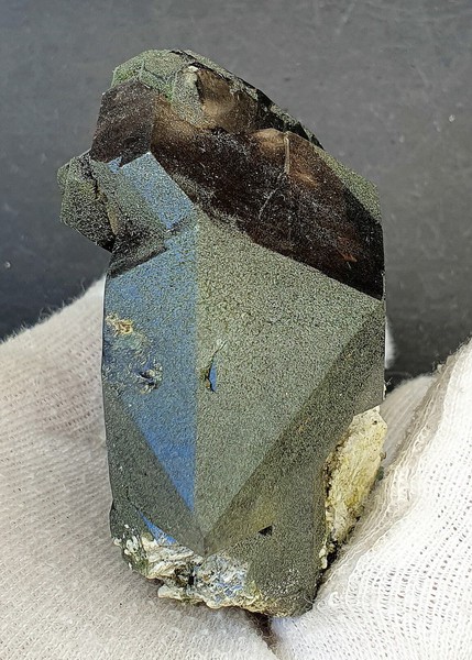 Das Gwindel zeigt mehrere leicht versetzte Spitzen und durch grau-grünen Chlorit-Einschluss schimmernde Oberflächen. Es gibt größere Bruchflächen und Anwachserstellen sowie einen Bergkristall-Anwachser. Gewicht: 140 g.