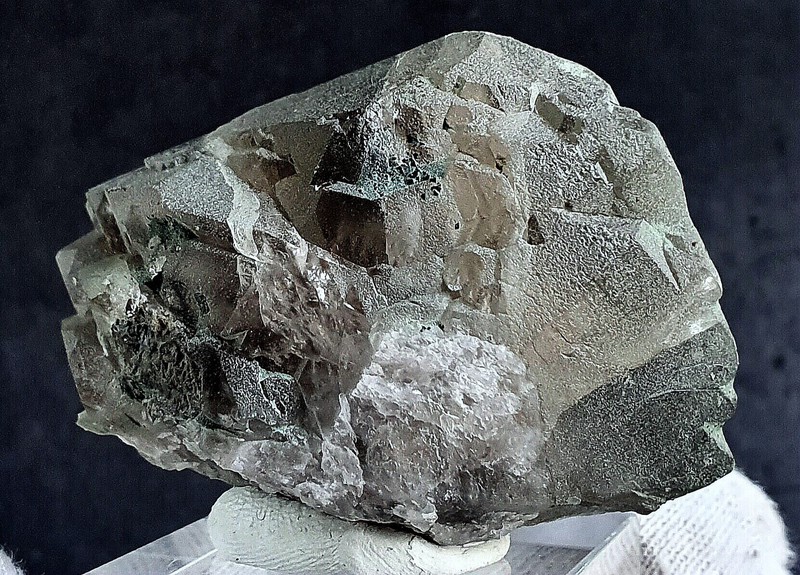 Die Gwindel-Stufe ist rundherum kristallisiert. Sie trägt neben kleineren Rauchquarzen bis ca. 20 mm ein glasklares und sehr dunkelbraun gefärbtes Gwindel von ca. 40 x 30 x 15 mm Größe. Die Unterseite der Stufe ist mit kleinen Quarzen und weißen Adularen bewachsen. Gewicht: 69 g.