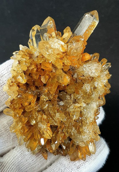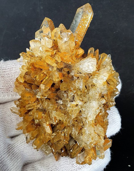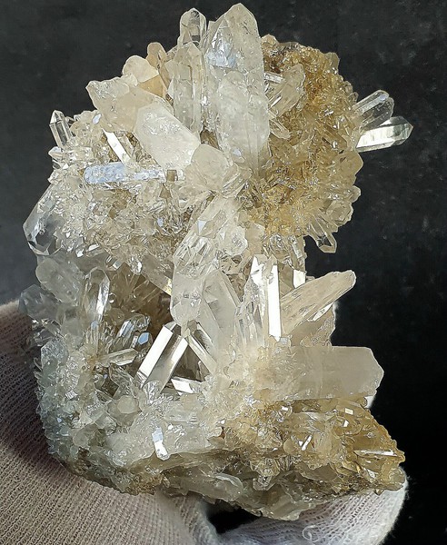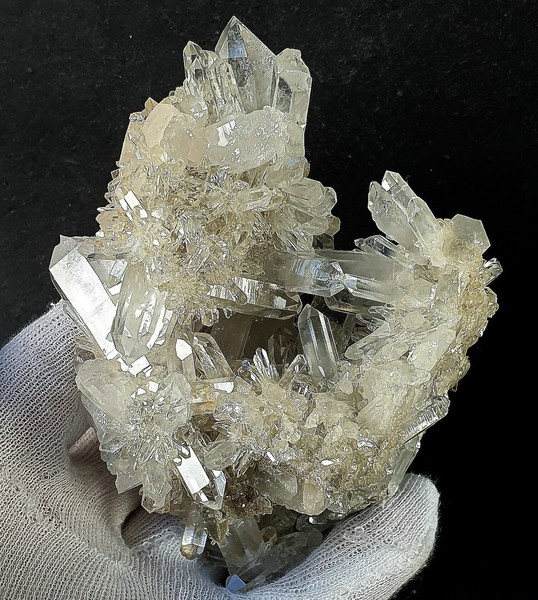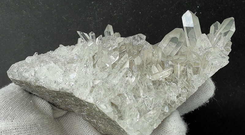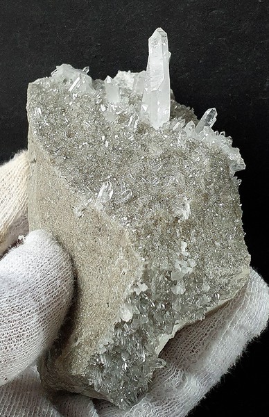 Diese Handstufe ist auf allen Seiten mit sehr vielen hochglänzenden Bergkristallen bewachsen. Diese messen bis ca. 50 mm und sind oftn wasserklar. Als Besonderheit gibt es regelrecht Kluft-Hohlräume, in die die Bergkristalle ragen. Manche Quarze weisen Absplitterungen auf. Gewicht: 357 g.