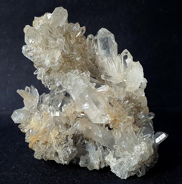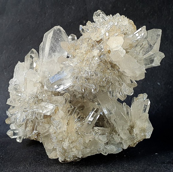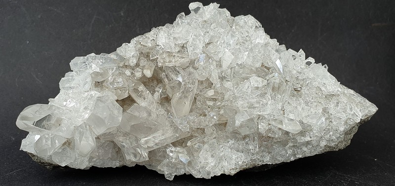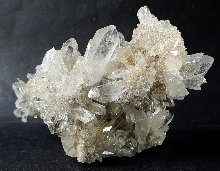 Diese helle Bergkristall - Stufe ist rundherum kristallisiert und trägt vor allem auf einer Seite reichlich hochglänzende Bergkristalle bis ca. 30 mm. Teils haben sie Einschlüsse von feinen Tonpartikleln. Gewicht: 248 g.