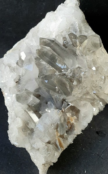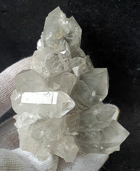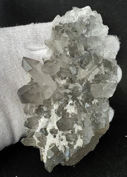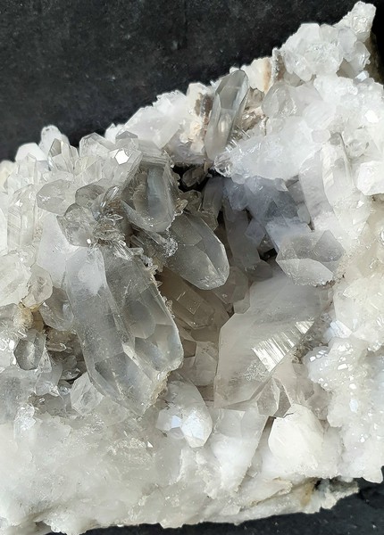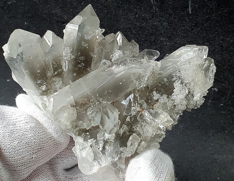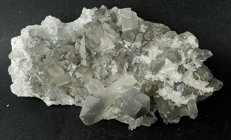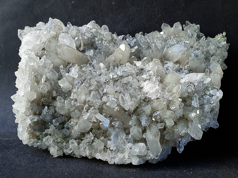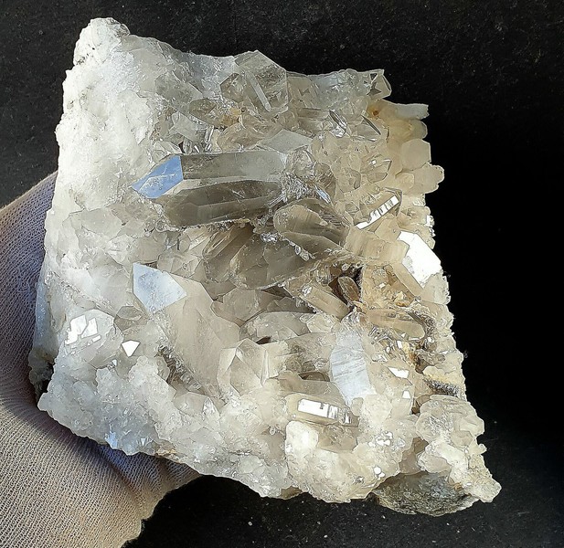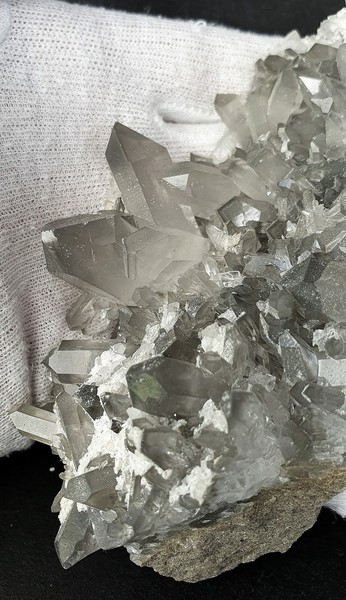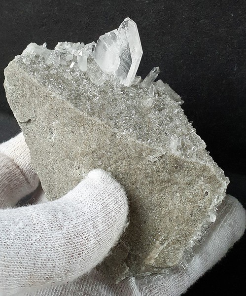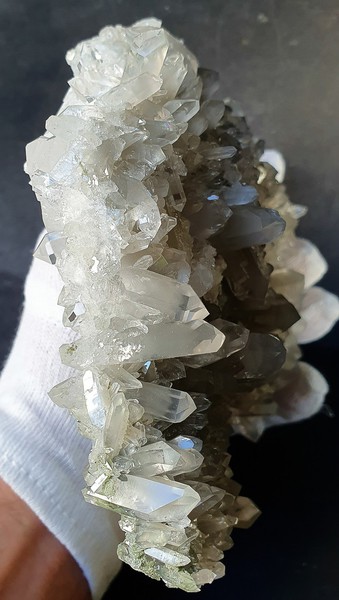 Diese Handstufe ist auf allen Seiten mit hochglänzenden Kristallen besetzt. Durch feinste Ton-Einschlüsse grau gefärbte Quarze zeigen im Innern sehr oft deutliche Phantomkanten früherer Wachstumsphasen. Darauf ist eine zweite Generation von Quarzen als helle Bergkristalle gewachsen. Die Rückseite der Stufe trägt viele weiße und wasserklare Bergkristalle. Der größte Quarz ist ein Doppelender von ca. 50 mm. Gewicht: 1276 g.