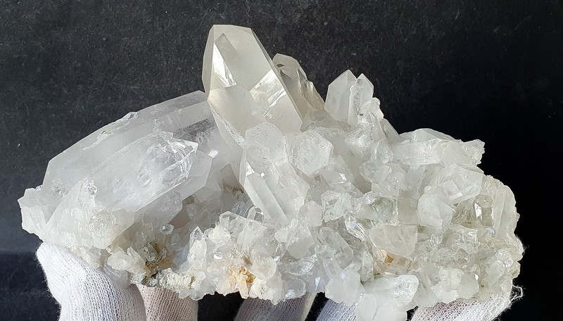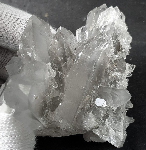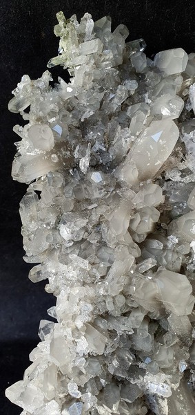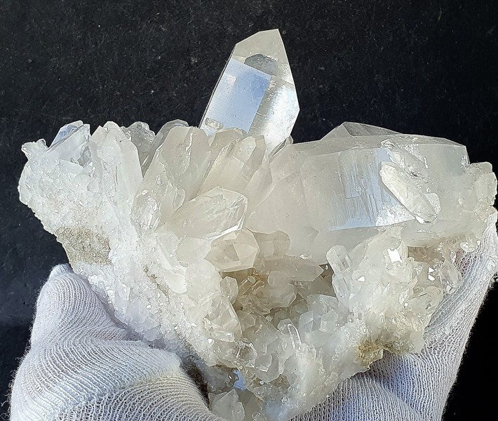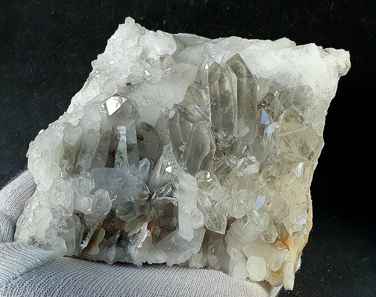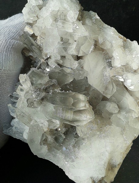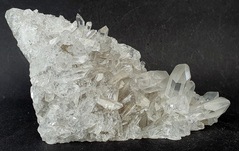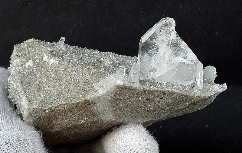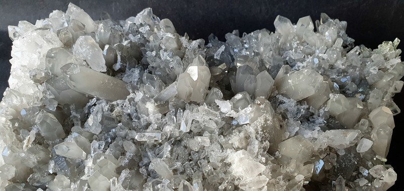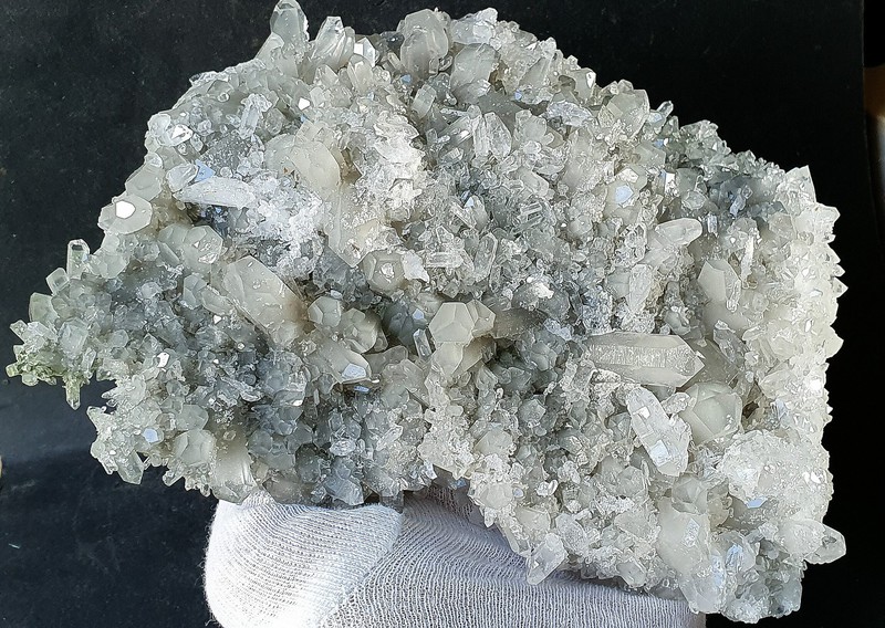 Diese Handstufe ist auf allen Seiten mit hochglänzenden Kristallen besetzt. Durch feinste Ton-Einschlüsse grau gefärbte Quarze zeigen im Innern sehr oft deutliche Phantomkanten früherer Wachstumsphasen. Darauf ist eine zweite Generation von Quarzen als helle Bergkristalle gewachsen. Die Rückseite der Stufe trägt viele weiße und wasserklare Bergkristalle. Der größte Quarz ist ein Doppelender von ca. 50 mm. Gewicht: 1276 g.