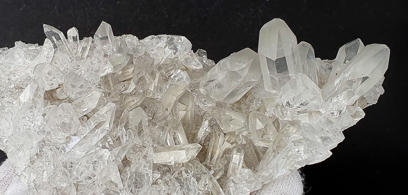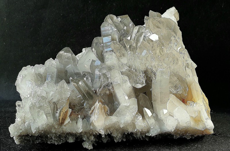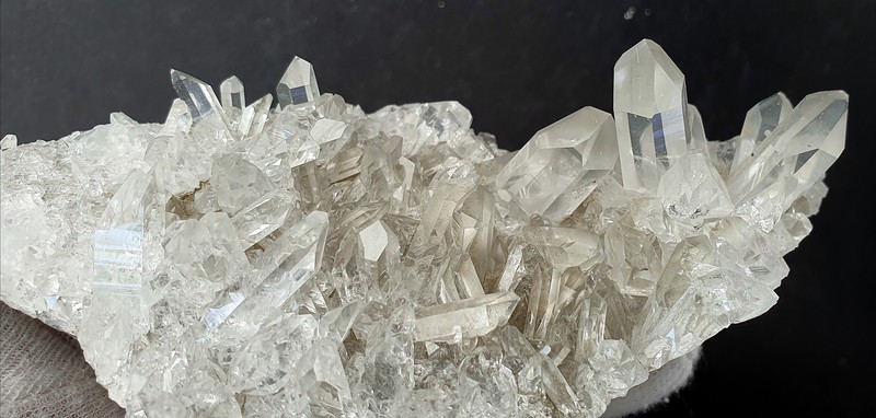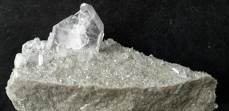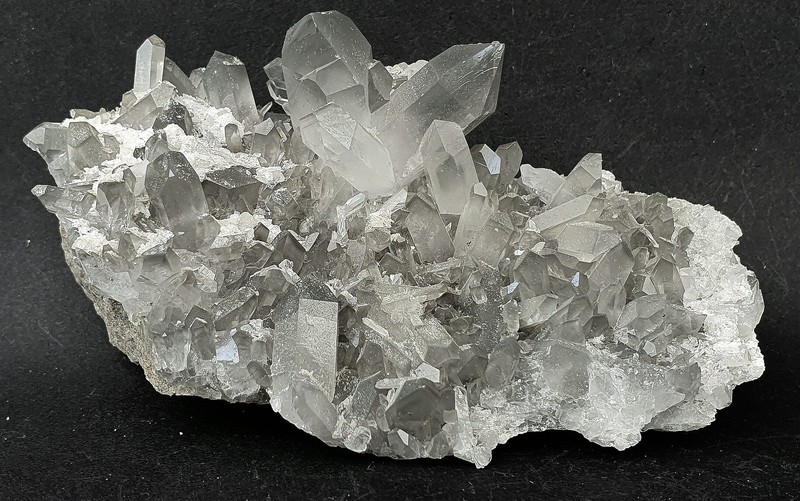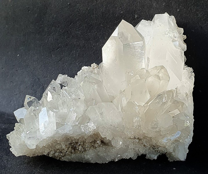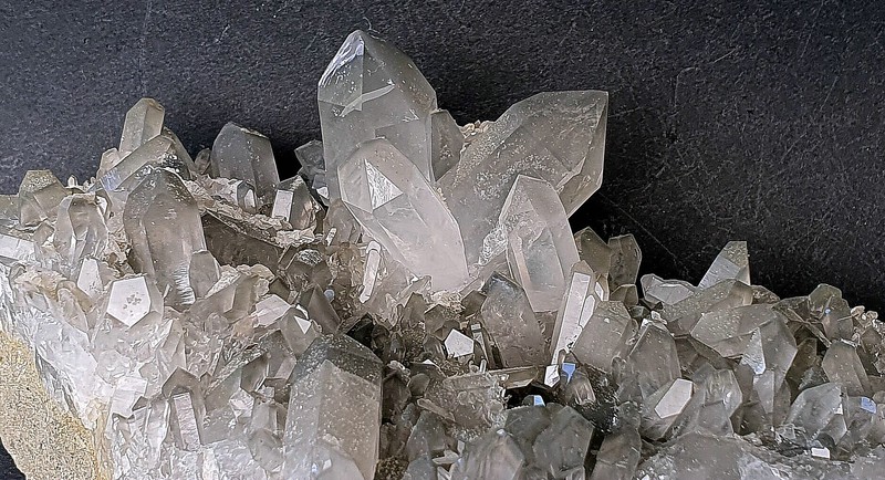 Auf schiefriger Gesteinsmatrix ist ein parallel verwachsenes Aggregat aus teils klaren hochglänzenden Bergkristallen gewachsen. Auch die vielen anderen Bergkristalle sind oft glasklar. In den größeren Quarzen gibt es zur Basis hin schlierige Einschlüsse von Ton-Substanzen. In einem Bergkristall sind kleine Ilmenit-Plättchen eingeschlossen. Der größte Bergkristall weist an der Spitze eine Absplitterung auf. Dazu gehört eine Partie mit angelösten tafeligen Calciten. Gewicht: 95 g.