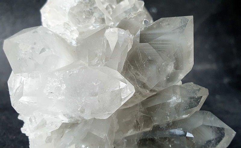 Die Kristalle zeigen hogen Glanz auf den Flächen und im Innern grau-grüne Ablagerungen durch Tonschiefer-Substanzen. Diese bilden Kanten ehemaliger Wachstumsphasen (Phantome) ab. Die Phantomquarze sind auf einen Acryl-Sockel gekittet.
