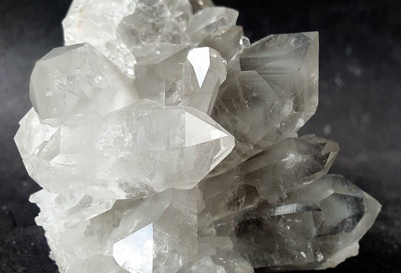 Die hochglänzenden Bergkristalle der Stufe weisen durch feine Einschlüsse von Ton-Substanzen eine graue Farbe auf. In einigen davon sind deutliche Phantom-Kanten früherer Wachstumsphasen abgebildet. Auf den grauen Bergkristallen gibt es eine zweite Generation von vielen hellen Quarz-Kriställchen. Gewicht: 290 g.