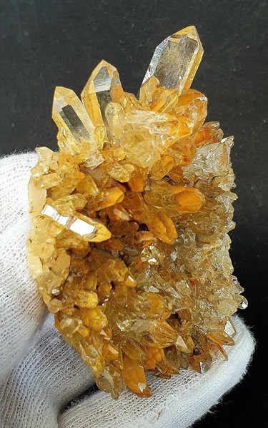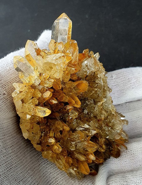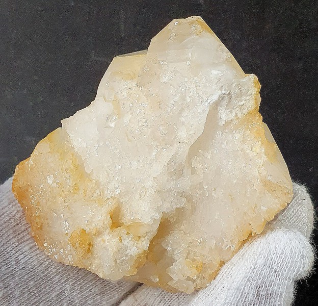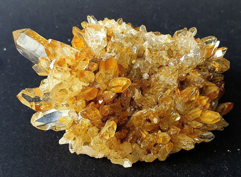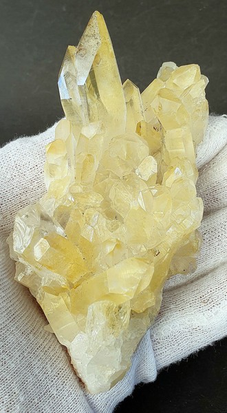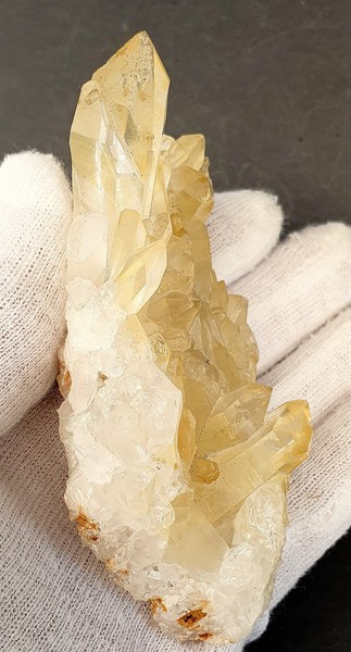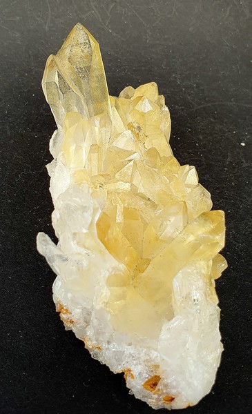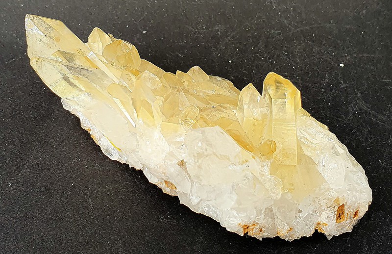 Die Bergkristalle sind im Dauphine-Habitus ausgebildet, teils glasklar und messen bis ca. 40 mm. Sie zeigen durch oberflächlichen Eisenhydroxid-Belag eine hellgelbe Farbe. Am Rand ist ein Kristall abgebrochen (siehe Bild 1, links oben). Auch die Unterseite ist kristallisiert. Gewicht: 166 g.
