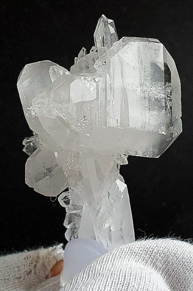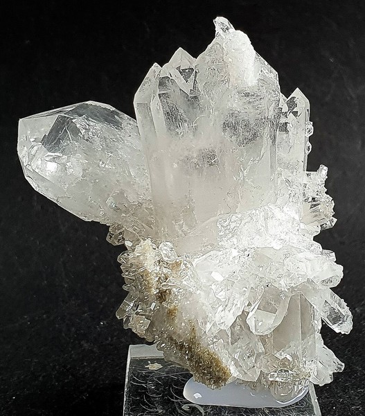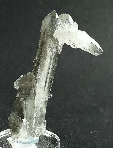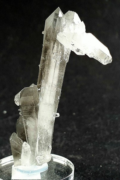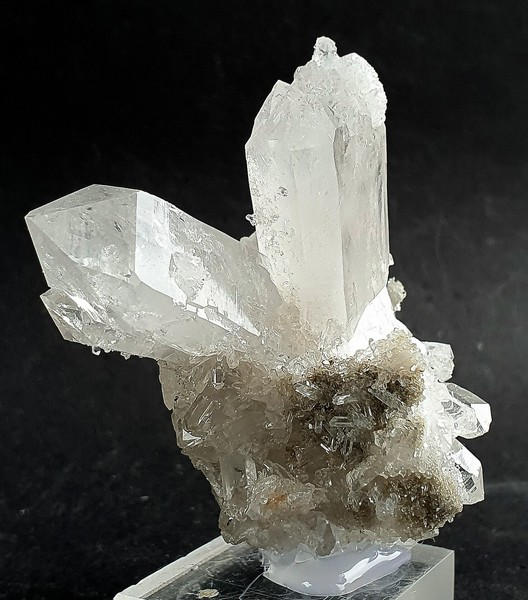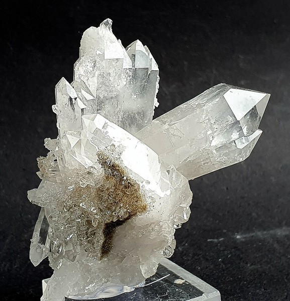 Dieses Quarz-Aggregat besteht aus mehreren flach verzerrten und oft doppelendigen Bergkristallen bis ca. 35 mm. Im Innern der hochglänzenden Kristalle sind die typischen milchig-weißen Wachstumsfäden zu erkennen. Gewicht mit Sockel: 39 g.
