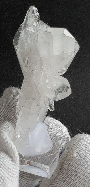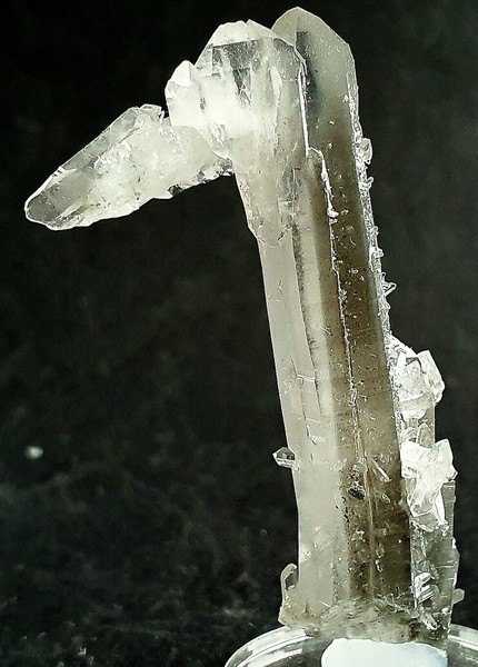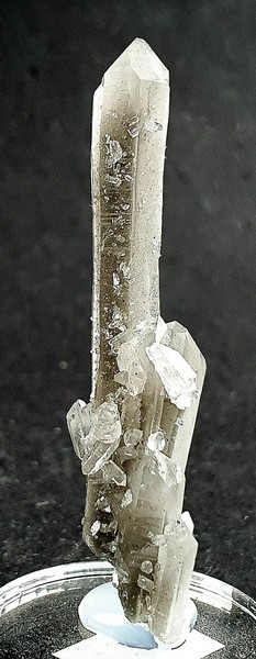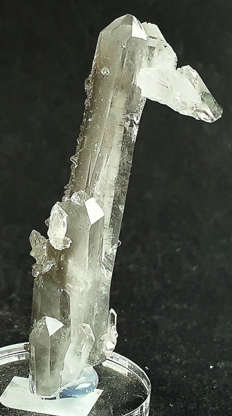 Der Hauptquarz der Stufe zeigt im Innern einen deulichen Wachstumsfade mit extrem vielen "Abschnitten" der Fluid-Einschlüsse. Zudem gibt es durch Einschlüsse grauer Ton-Substanzen Phantomkanten. Außerdem sitzen daran etliche Bergkristalle mit Faden und Phantomen sowie eine zweite Generation von winzigen Bergkristallen. Gewicht mit Sockel: 10 g