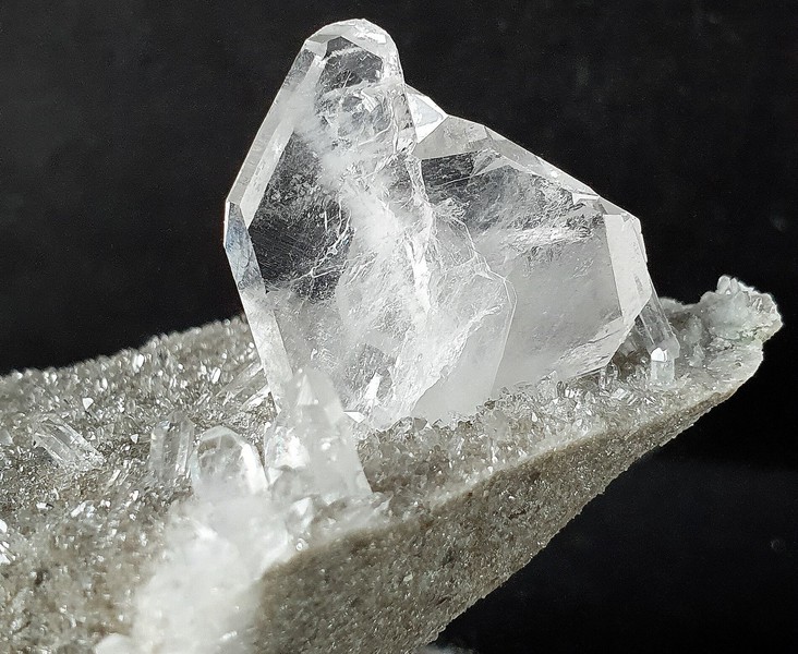 auf etwas Gesteinsmatrix sind viele hochglänzende und oft klare Bergkristalle bis ca. 45 mm gewachsen. Diese sind teils als Doppelender ausgebildet und weisen im Innern oft Phantomkanten früherer Wachstumsphasen auf. In einigen davon gibt es auch deutliche Mehrfachphantome. Außerdem gibt es eine zweite helle Quarz-Generation kleiner Bergkristalle. Gewicht: 218 g.
