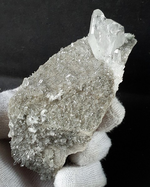 Die Stufe ist auf mehreren Seiten mit kleinen und winzigen, hochglänzenden Bergkristallen bewachsen. Dazu gehört ein sehr flaches Fadenquarz-Aggregat von ca. 27 x25 x 7 mm Größe. Gewicht: 267 g.