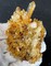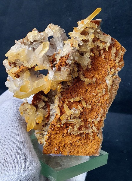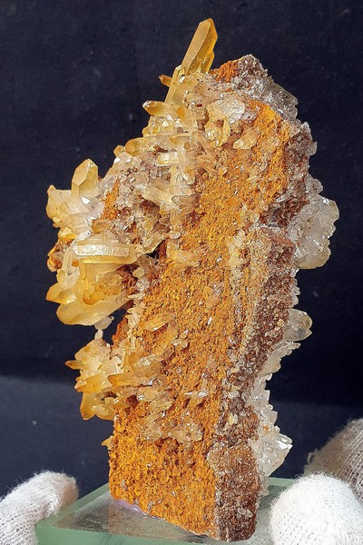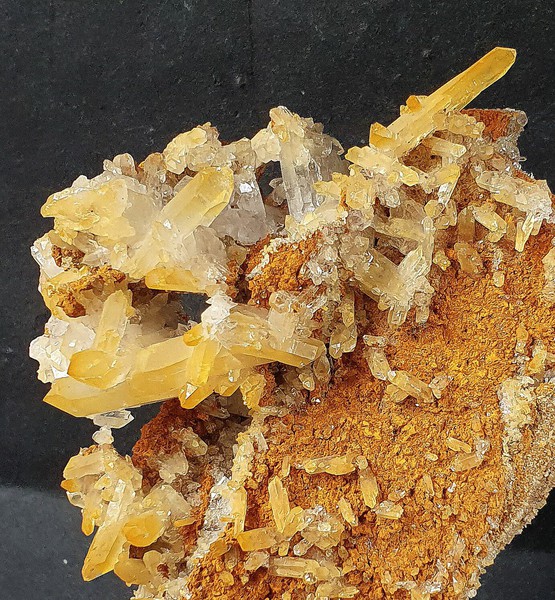 Auf Gesteins-Matrix sind viele glänzende Bergkristalle bis ca. 30 mm gewachsen, auch als Doppelender. Oberflächlich sind die Kristalle meist mit gelblichem Eisenhydroxid belegt. Dazu gehören in einer Partie winzige limonitisierte Siderit-Kristalle. Gewicht: 280 g