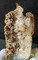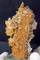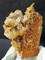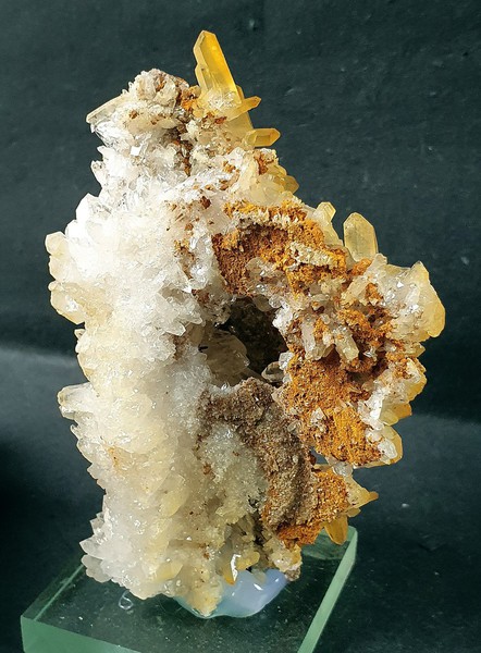 Rundherum sind viele Bergkristalle bis ca. 25 mm gewachsen. Teils zeigen sie durch Belag von Eisenhydroxid eine gelbliche Farbe. Auch andere Partien der Stufe sind mit ockerfarbigem Limonit belegt. Die Stufe ist auf einen Sockel gekittet. Gesamtgewicht: 216 g.