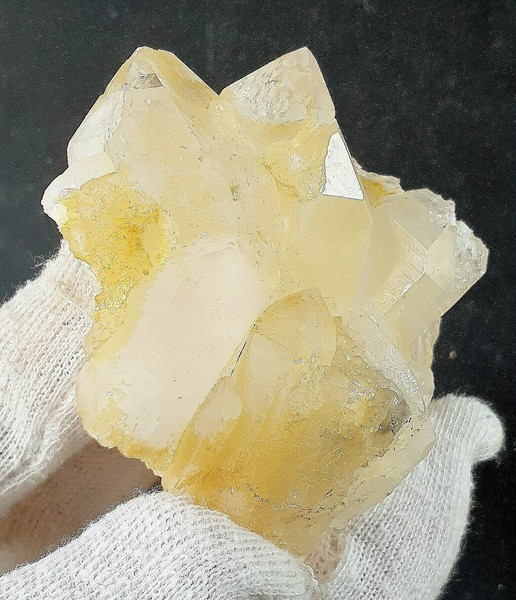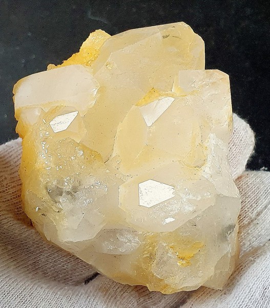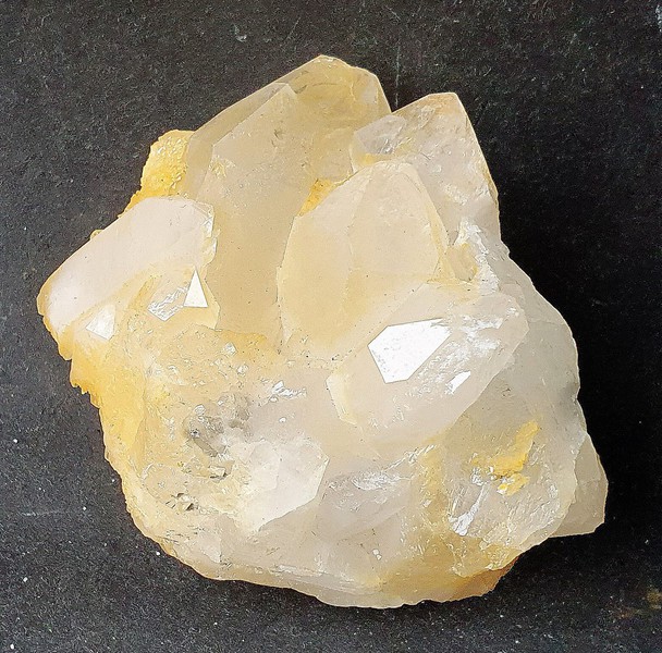 Die Stufe besteht aus einigen transparenten Bergkristallen bis ca. 40 mm, die meist durch Eisenhydroxid-Belag eine hellgelbe Farbe zeigen. Eine Seite der Stufe ist mit vielen Spitzchen rekristallisiert. Es gibt Absplitterungen. Gewicht: 166 g.