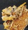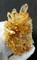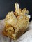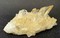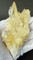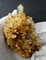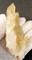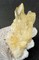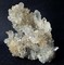 Auf dünner Quarz-Matrix sind viele meist klare und hochglänzende Bergkristalle bis ca. 20 mm gewachsen. Teils sind sie durch oberflächlichen Eisenhydroxid-Belag hellgelb. Dazu gehören mehrere angelöste porige, tafelige Calcite bis ca. 50 mm. Gewicht: 92 g.